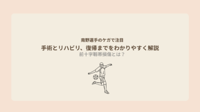 サッカー日本代表の南野選手が前十字靱帯損傷によりワールドカップ出場が厳しい状況と報じられ、多くの人に衝撃が走りました。 ニュースを見て「前十字靱帯って何?」「そんなに大きなケガなの?」「治らないの?」と疑問に思った方も多 … 続きを読む 南野選手のケガで注目|前十字靱帯損傷とは?手術とリハビリ、復帰までをやさしく解説