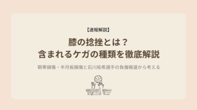 「膝の捻挫=軽いケガ」は誤解?ACL・MCL・半月板など、医療記事をもとに本当の中身を解説 膝の捻挫とは何か? ―「膝の捻挫」に含まれる具体的なケガの種類を徹底解説(石川祐希選手の報道をきっかけに)― 近年 … 続きを読む 膝の捻挫とは?含まれるケガの種類を徹底解説|靭帯損傷・半月板損傷と石川祐希選手の負傷報道から考える